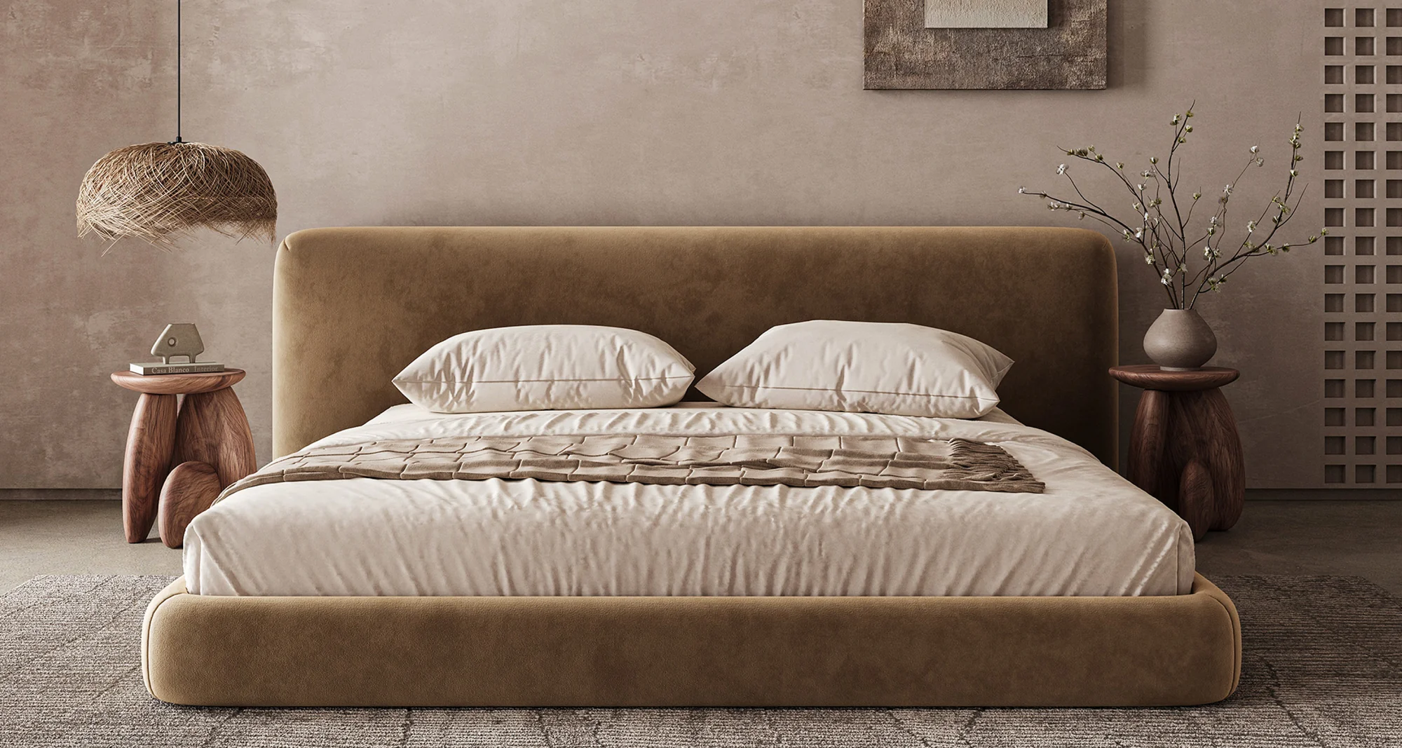 The Qube Bed features a plush, oversized headboard with a gently curved top that extends beyond the width of the bed frame, offering a modern yet cozy aesthetic. The entire piece is upholstered in a rich, camel-colored velvet fabric that provides a sumptuous texture and a luxurious feel. The bed frame itself is low-profile with a streamlined design that sits flush to the ground, accentuating its contemporary look.