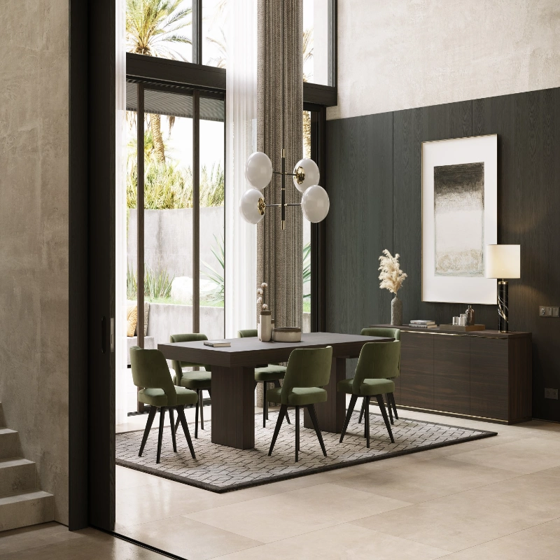 The Everyday dining room isn’t just a space for meals but also for spending time unplugged, with closed ones. The large table and the slim dining chairs create the perfect room to host dinner parties. Everyday occasions are special occasions. The dark wooden sideboard provides the mandatory storage space for decors designed to be the soul of any home.