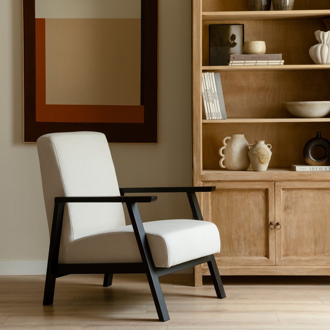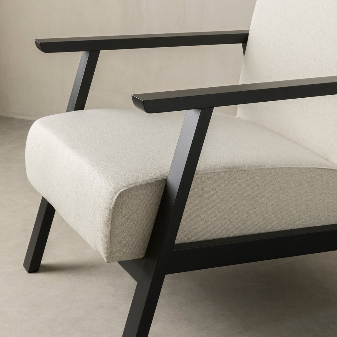 Add a beautiful touch of color with the Wood armchair. The combination of the black finish of its structure with the seat upholstered in a soft gray tone makes it a comfortable and stylish design, bringing a modern touch to your living room or any of your rooms.