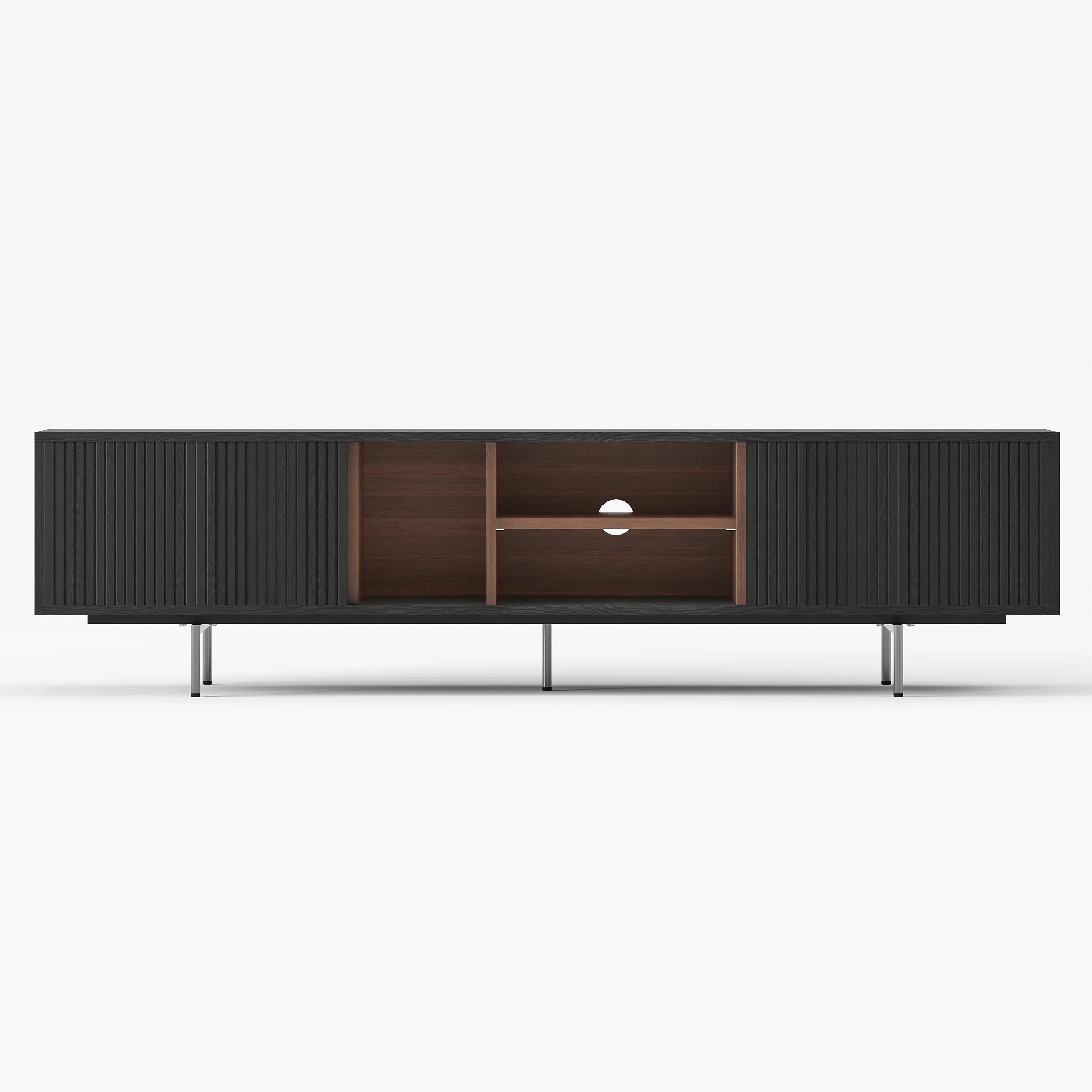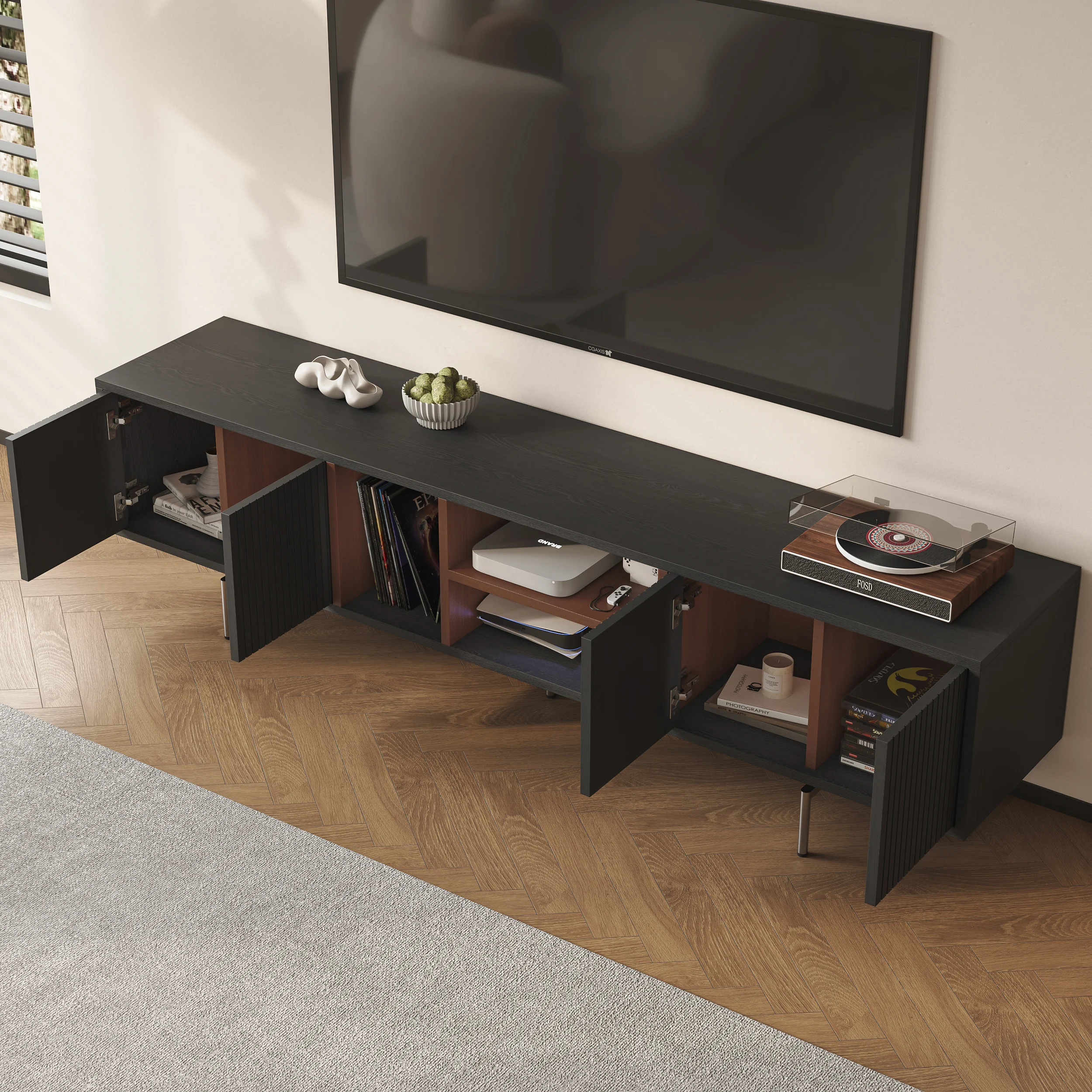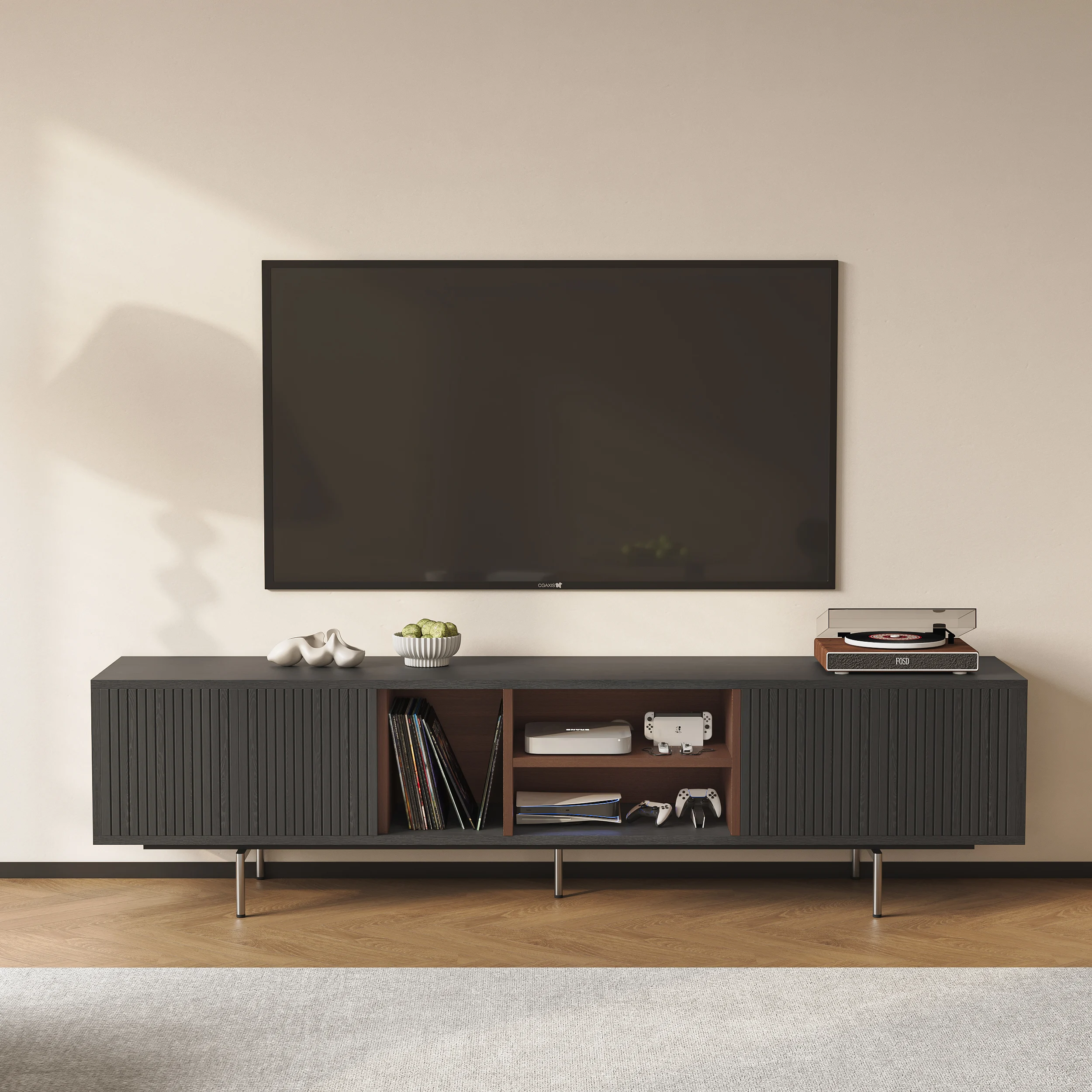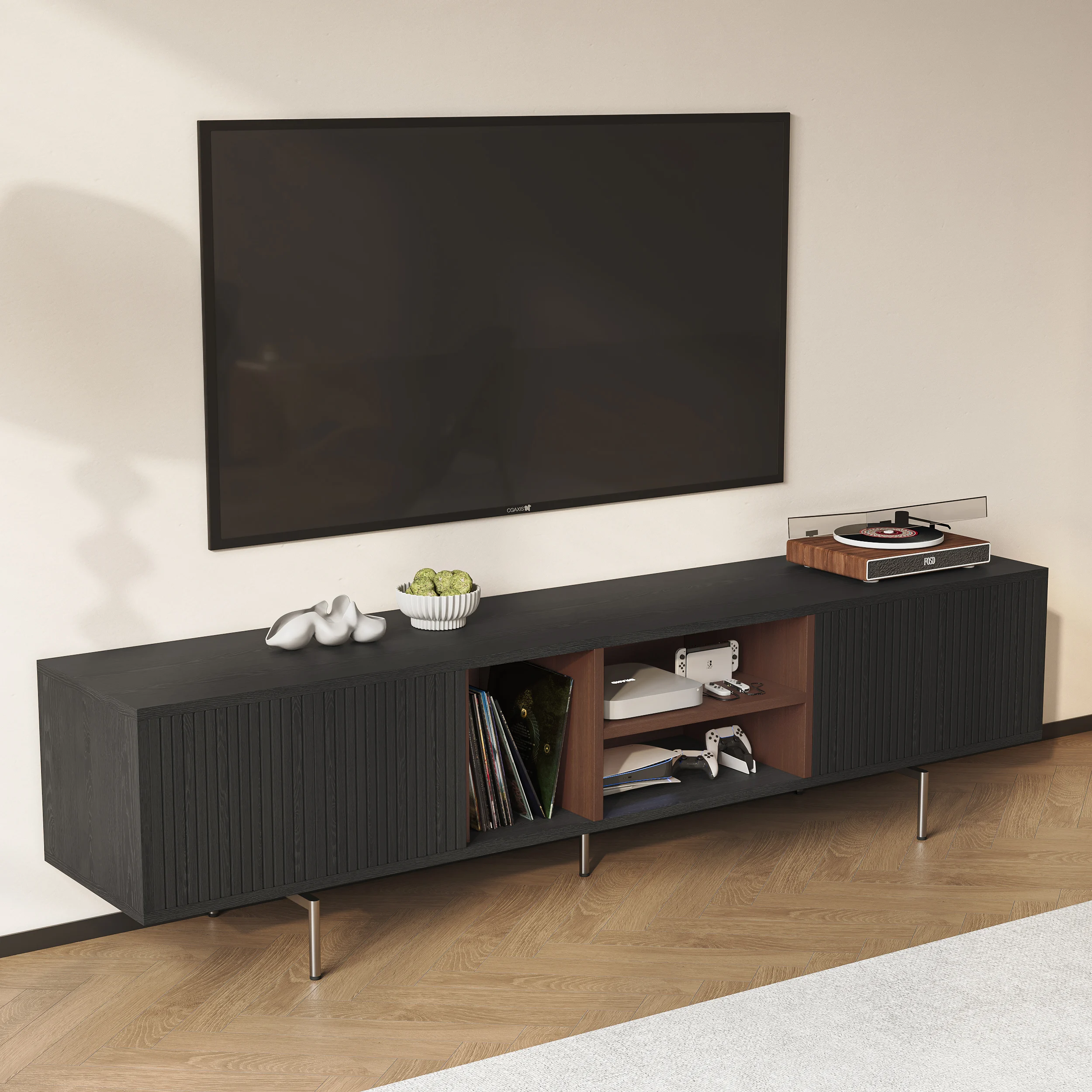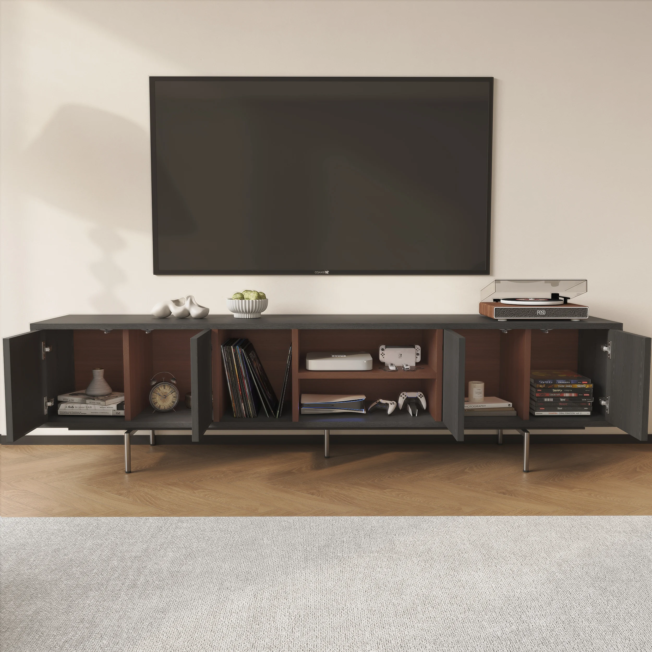 Its elevated base and clean lines create a light, airy presence, while four soft-close doors provide generous concealed storage. An open-shelf display keeps media essentials within reach, and built-in cable management ensures a clutter-free setup. Raised legs also allow robot vacuums to glide underneath—perfect for effortless cleaning.