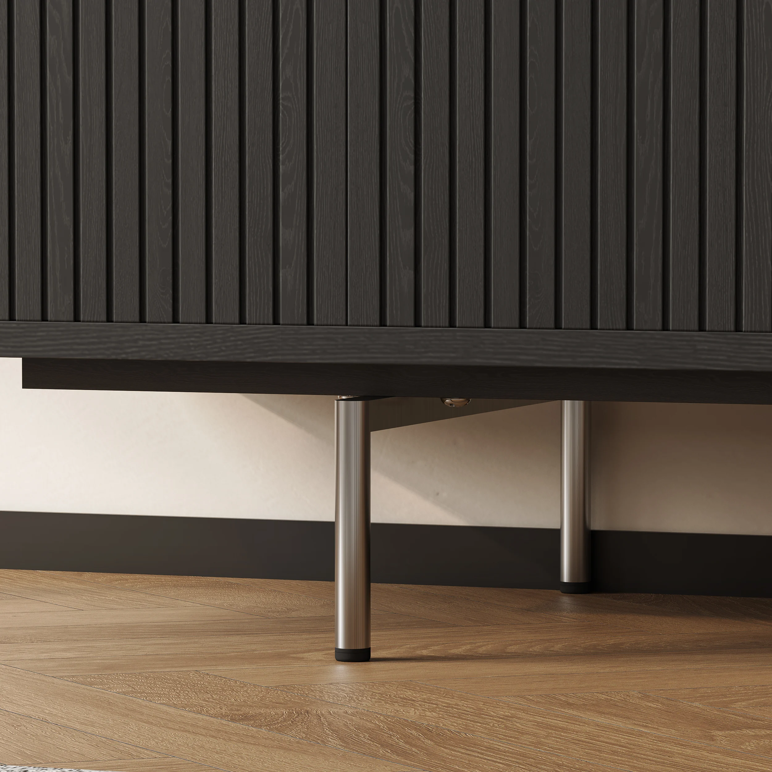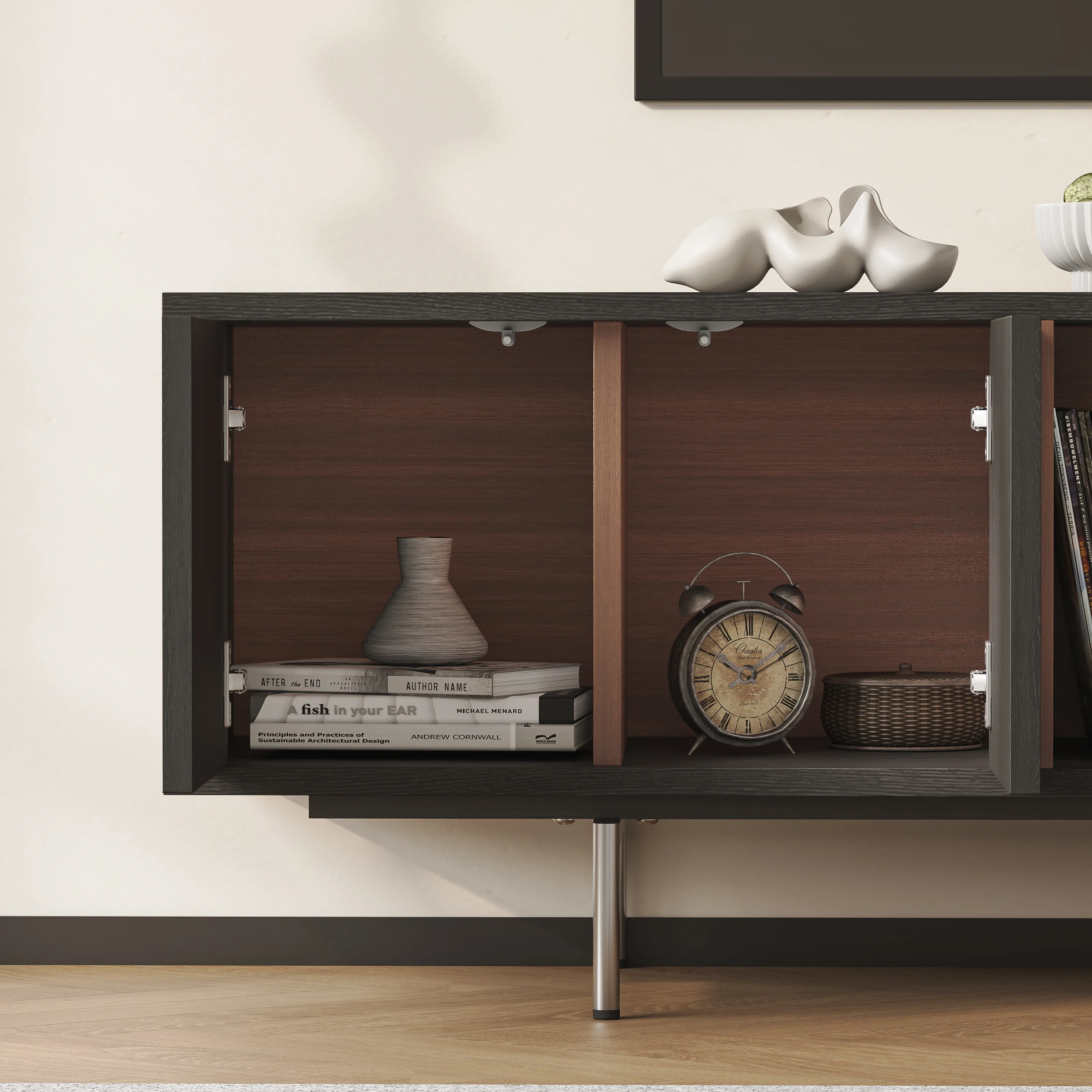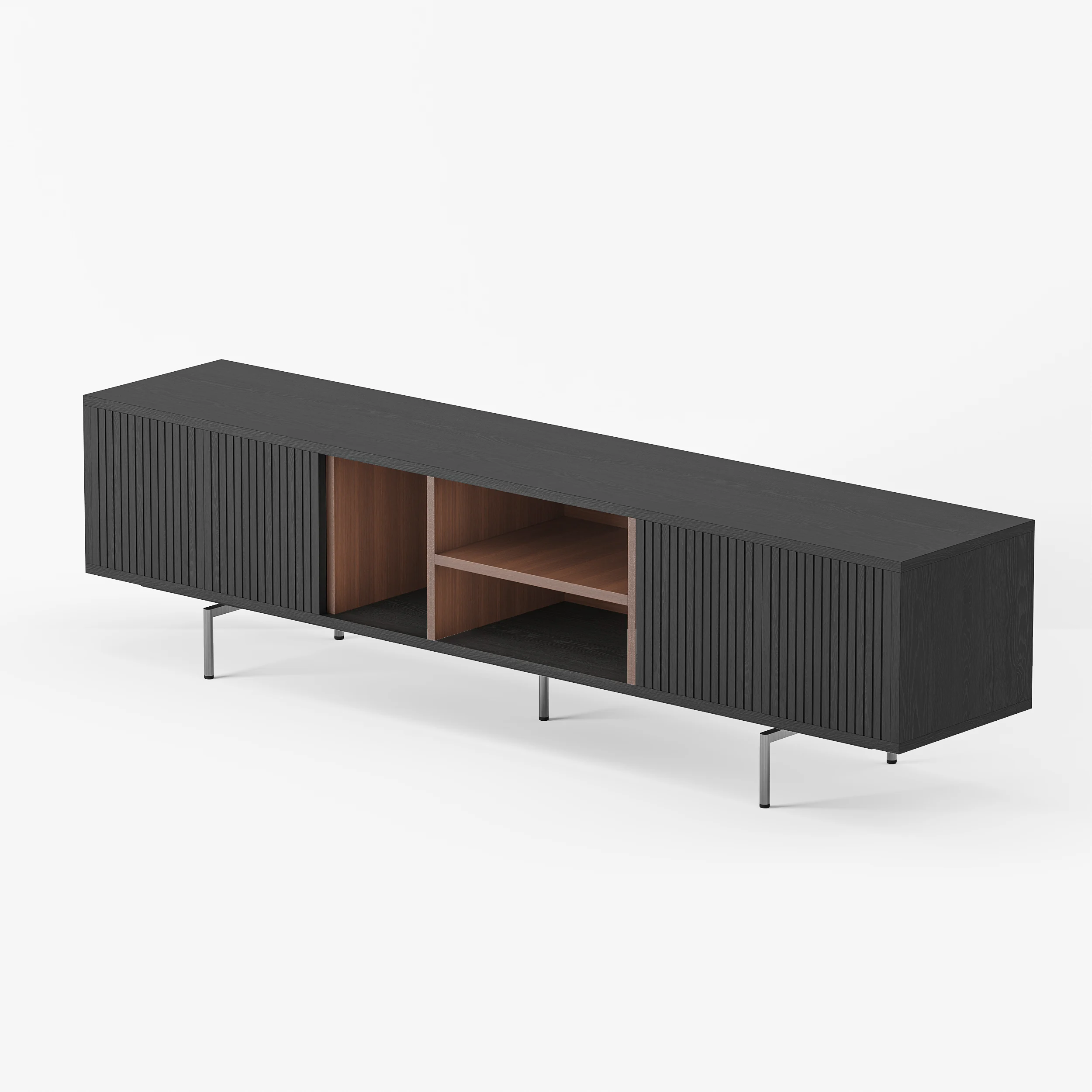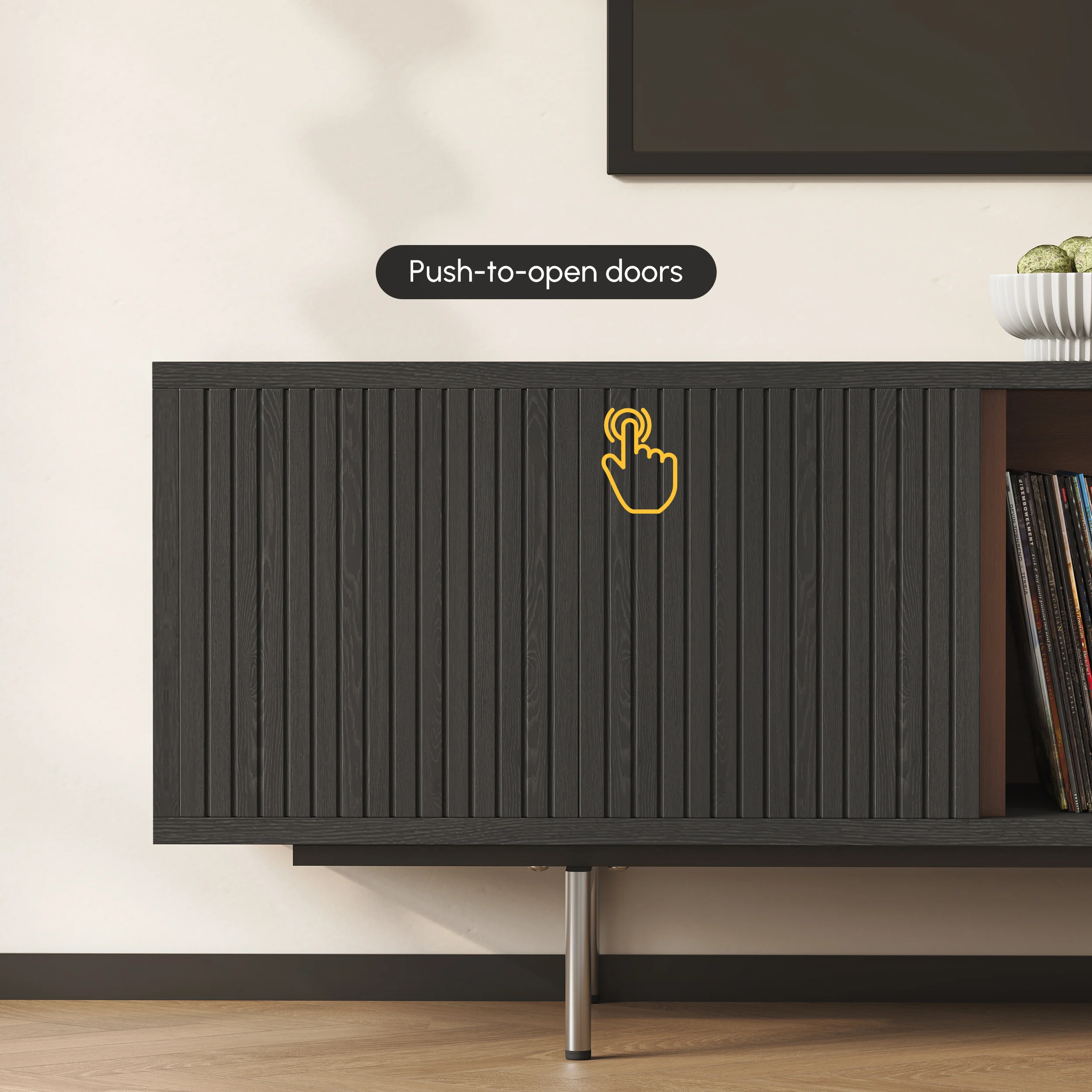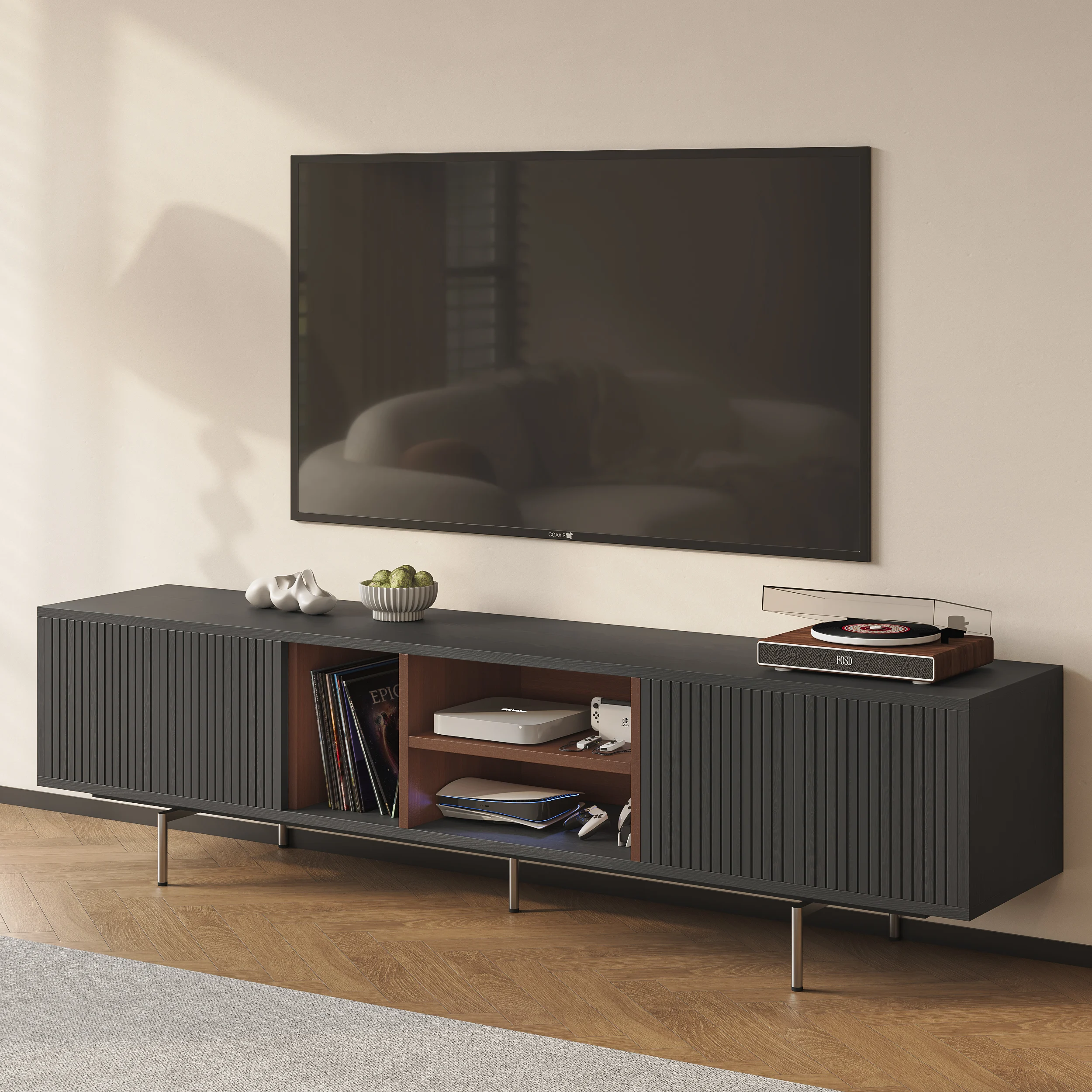 Its elevated base and clean lines create a light, airy presence, while four soft-close doors provide generous concealed storage. An open-shelf display keeps media essentials within reach, and built-in cable management ensures a clutter-free setup. Raised legs also allow robot vacuums to glide underneath—perfect for effortless cleaning.
