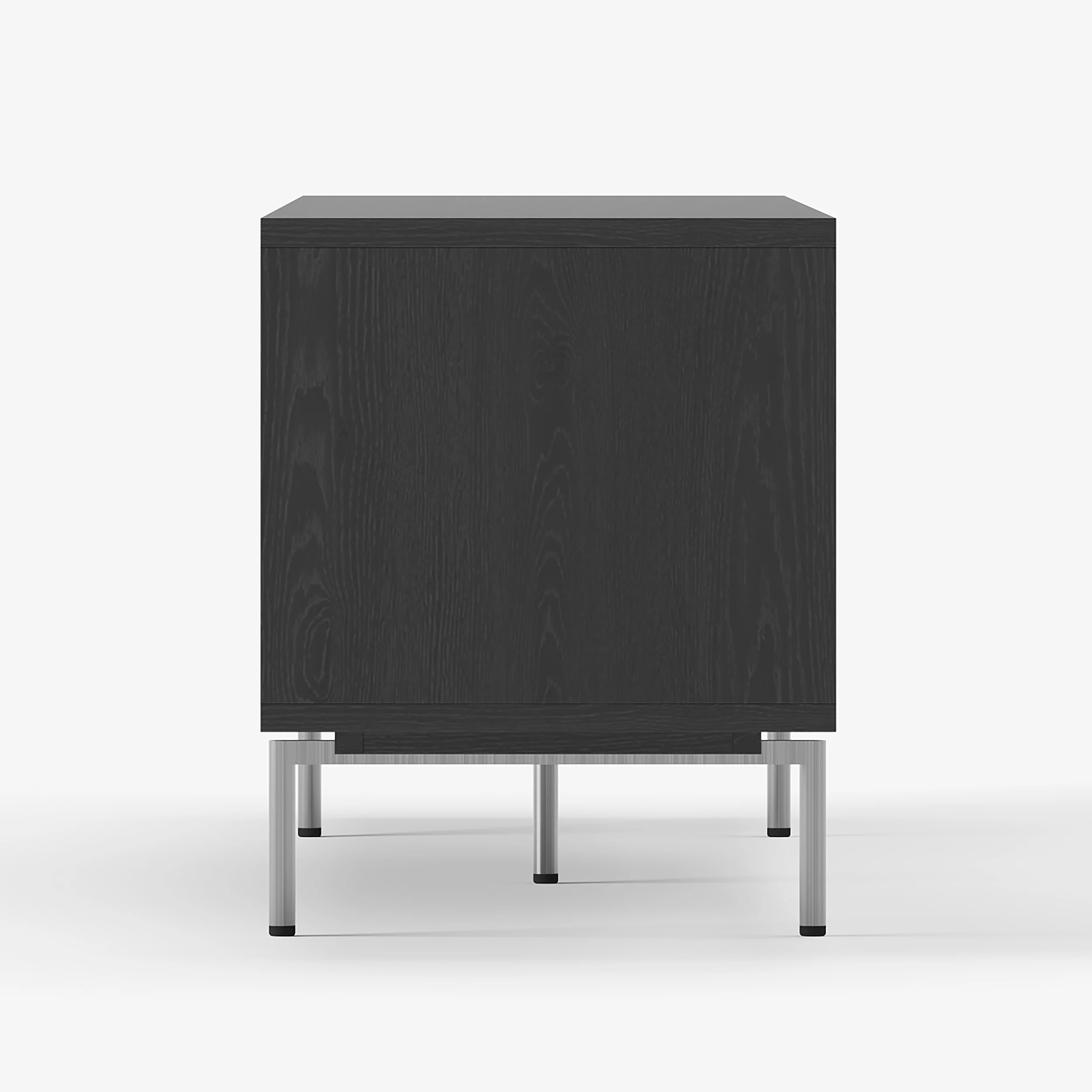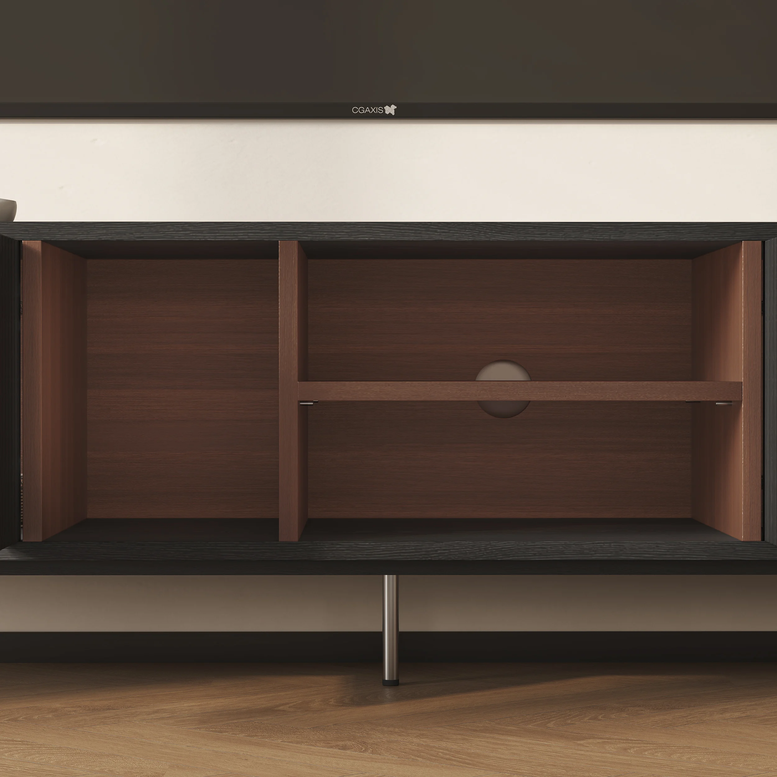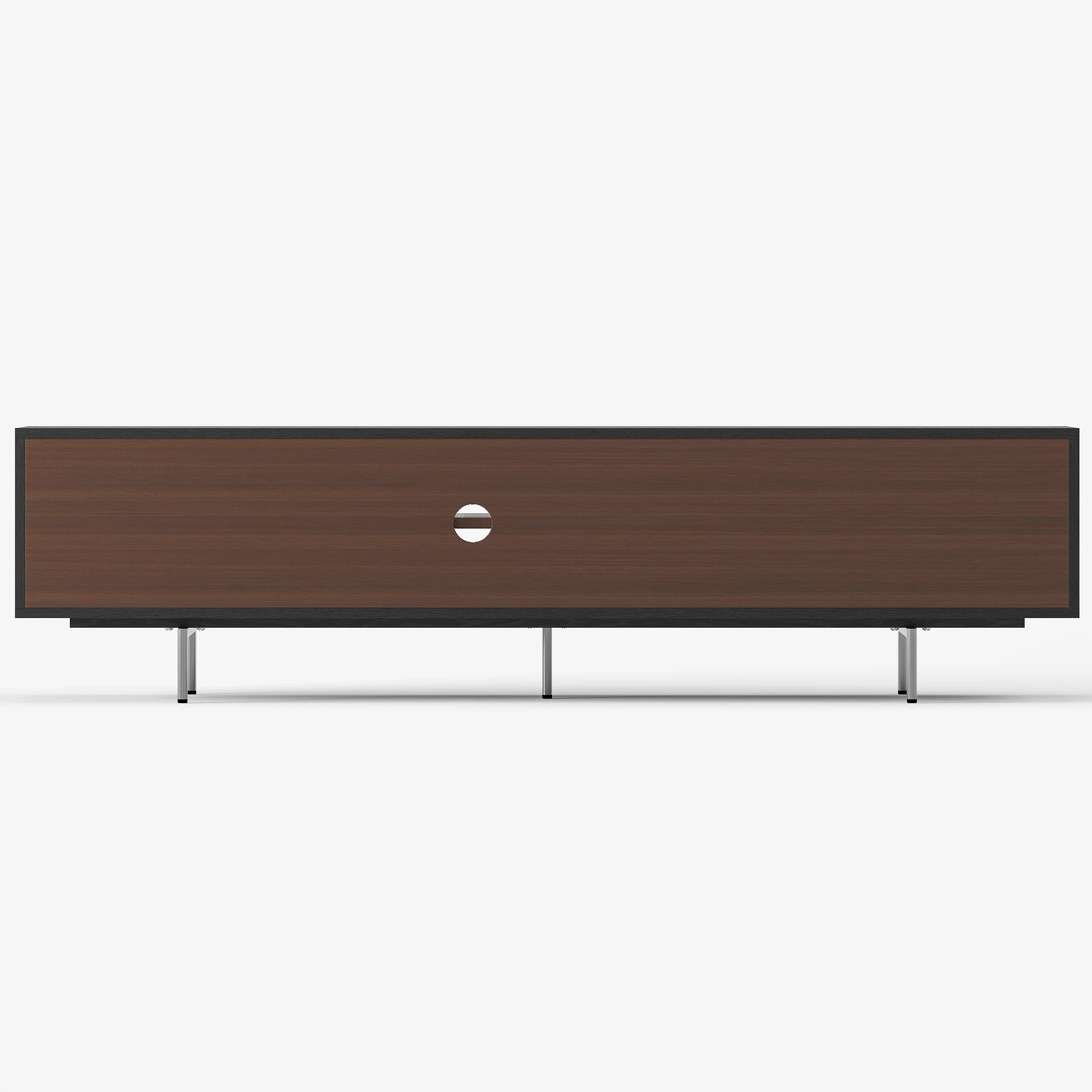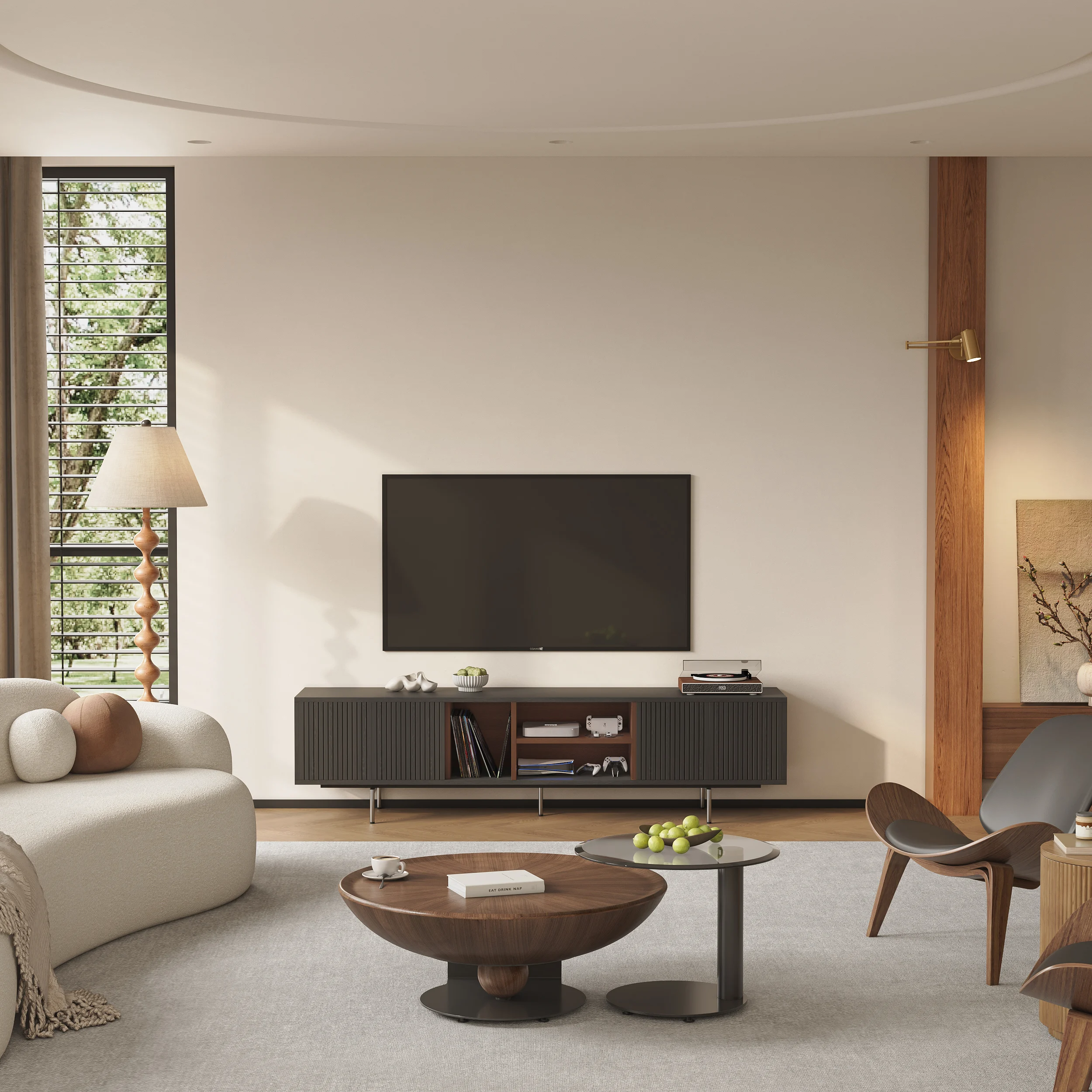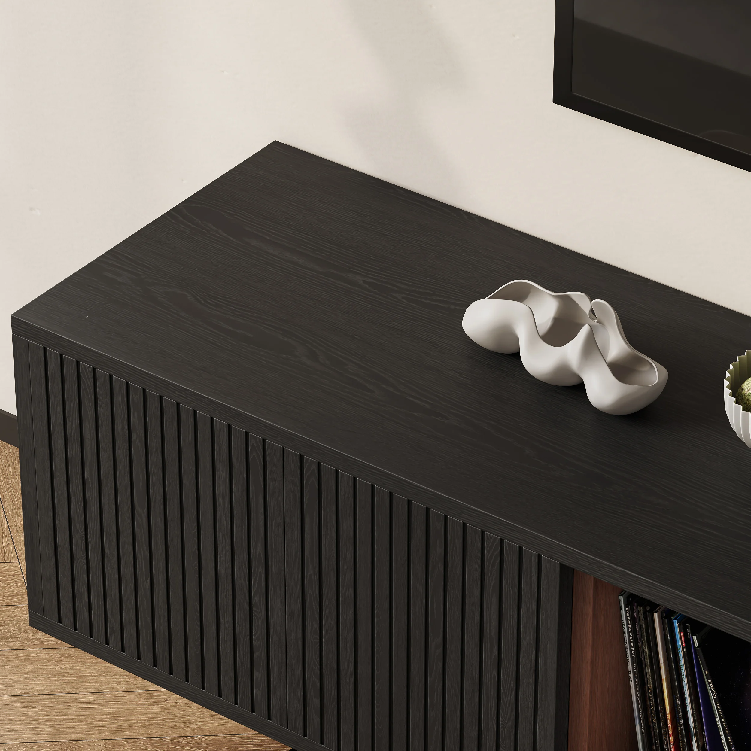 Its elevated base and clean lines create a light, airy presence, while four soft-close doors provide generous concealed storage. An open-shelf display keeps media essentials within reach, and built-in cable management ensures a clutter-free setup. Raised legs also allow robot vacuums to glide underneath—perfect for effortless cleaning.