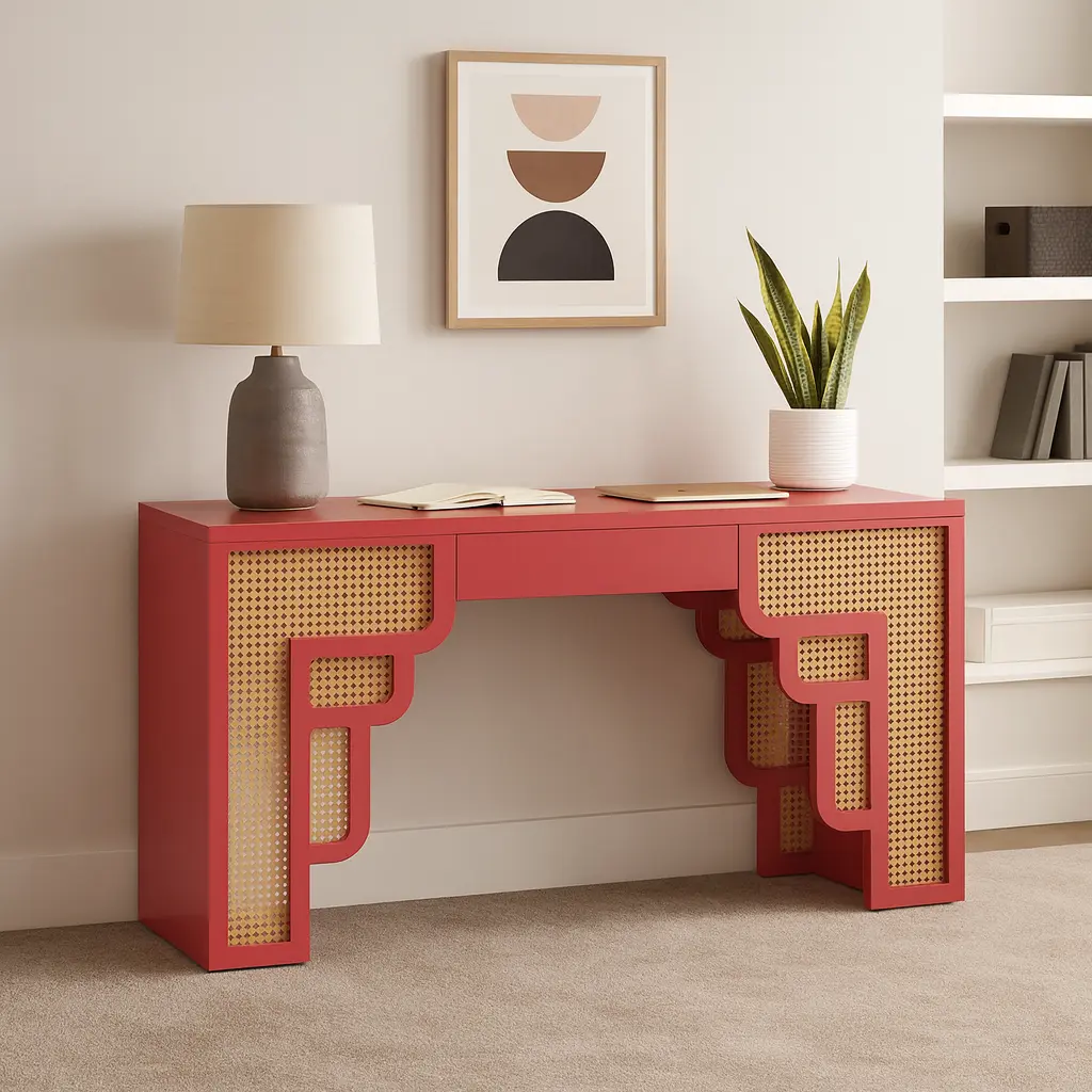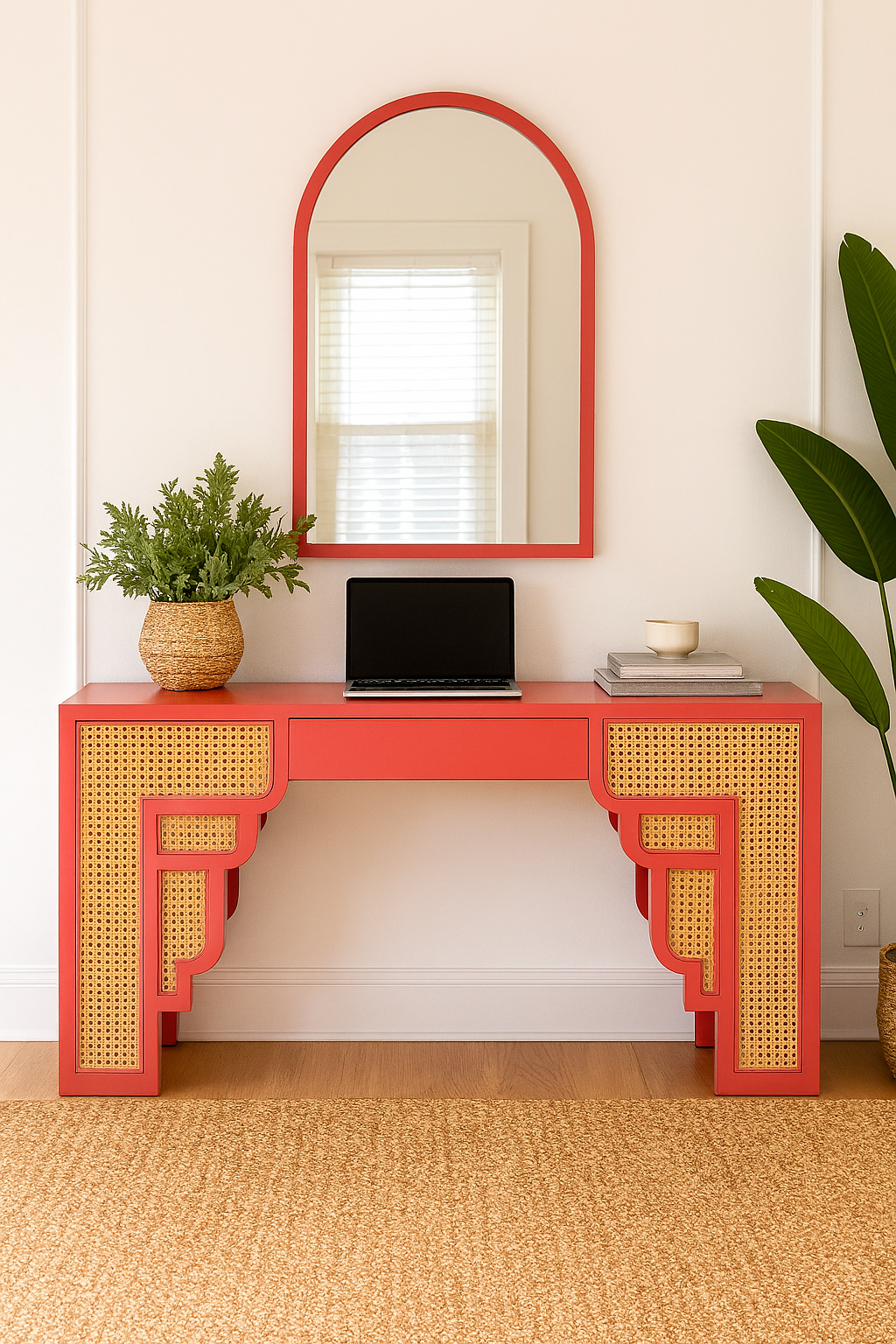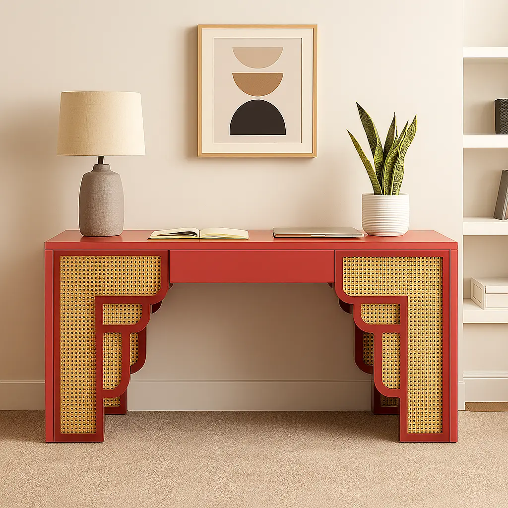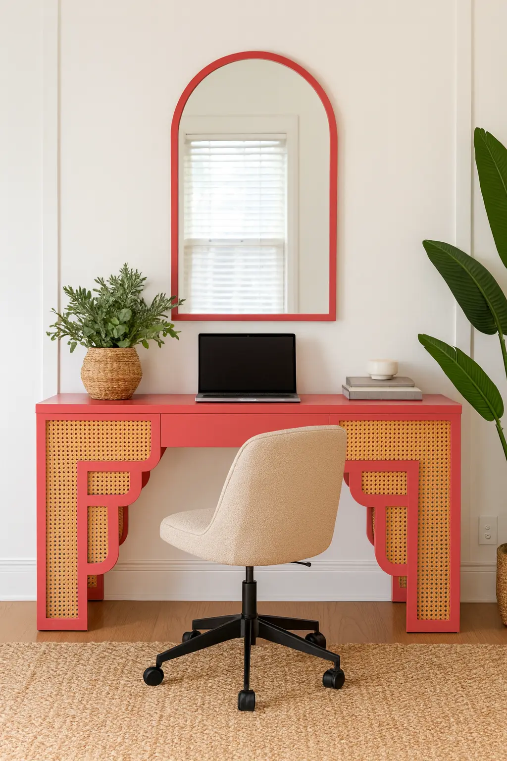 The Palmera Rattan Desk is infused with the spirit of Art Modern design, channeling the vibrant charm of Palm Springs with its swooping curves and bold pink hue. Crafted from durable MDF and accented with woven rattan, this desk is more than furniture—it’s a statement piece that blends function and flair.